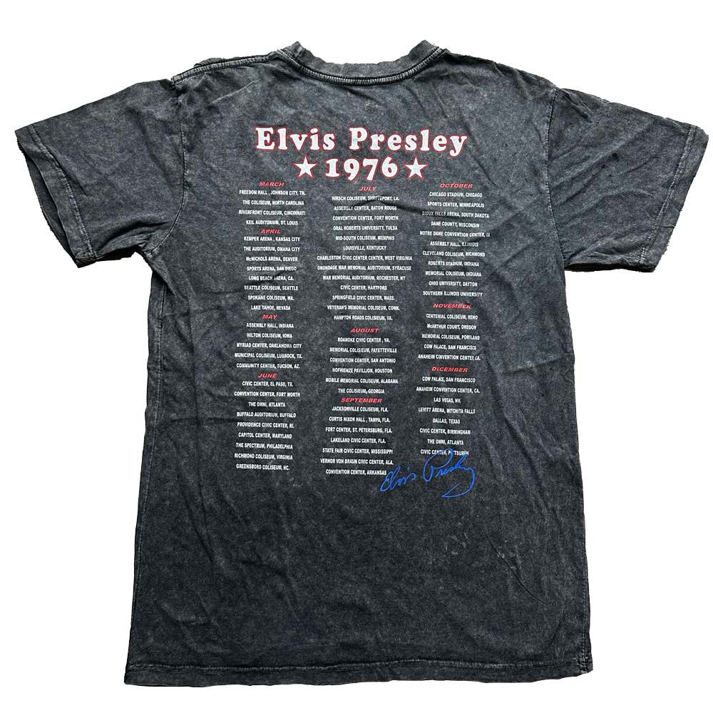 Officially Licensed Elvis Presley Merchandise. Beautiful acid washed t-shirt. Double sided, 1976 tour dates on the back.