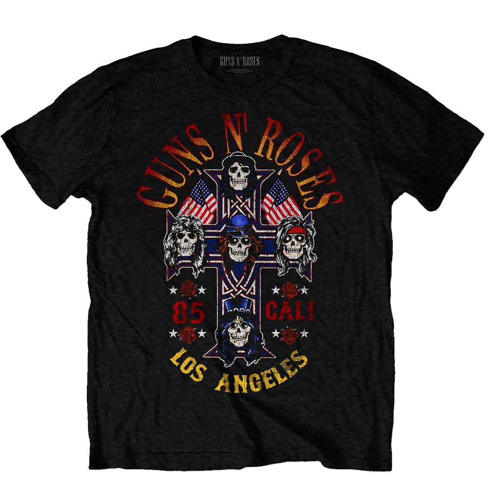 Officially Licensed Guns N' Roses Unisex T-Shirt featuring the 'Cali' '85' Los Angeles design motif. This high quality T-Shirt is available in a black colourway.