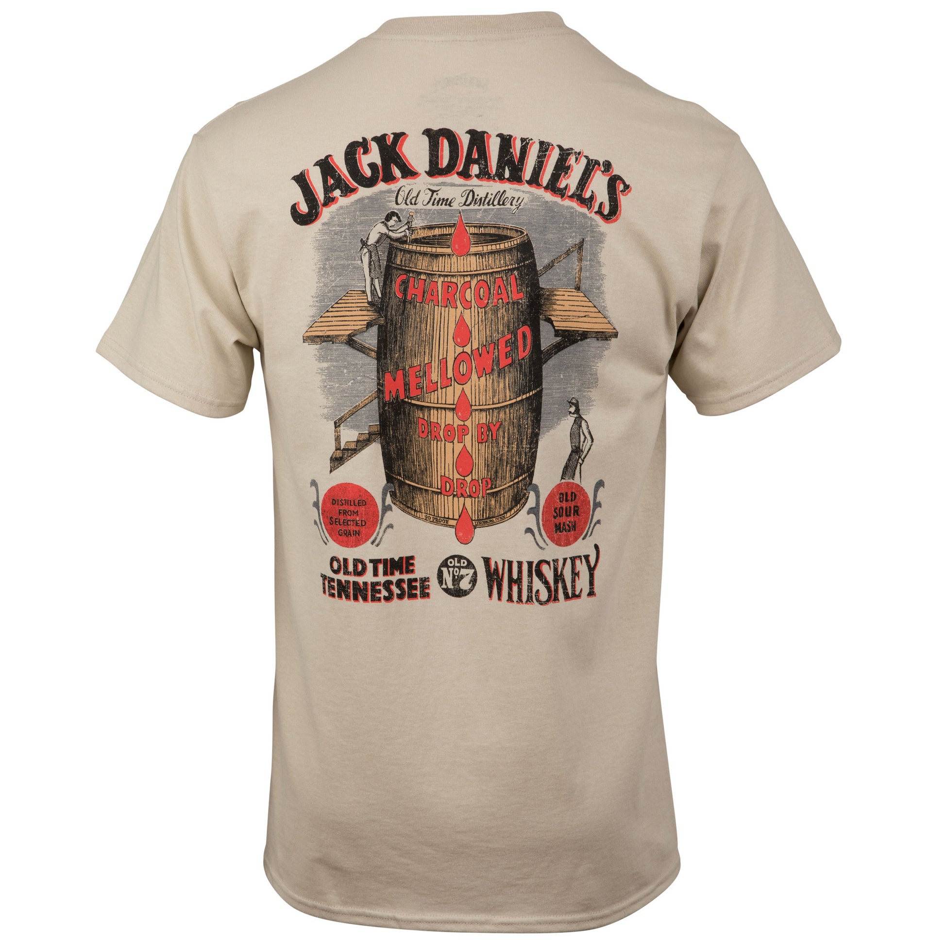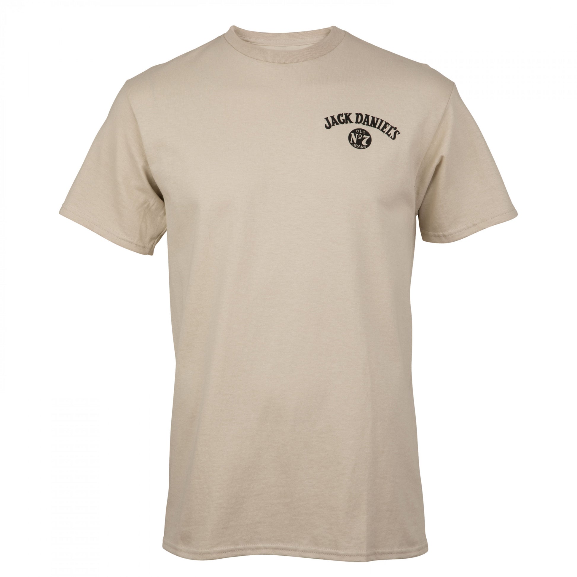 Officially licensed Jack Daniels Whisky Barrel Front and Back Print T-Shirt. This tan "Jack Daniel's" t-shirt is made from 100% cotton and features a classic "Jack Daniel's Whisky Barrel" logo design printed on the front and back.