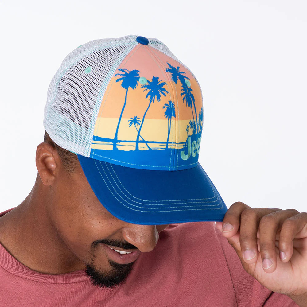 The perfect beach-ready trucker hat to protect your "Jeep Hair." Our Jeep® "Beach Sunset" hat features a dreamy beach scene and iconic Jeep® logo embroidery. It will keep you cool on all your adventures.