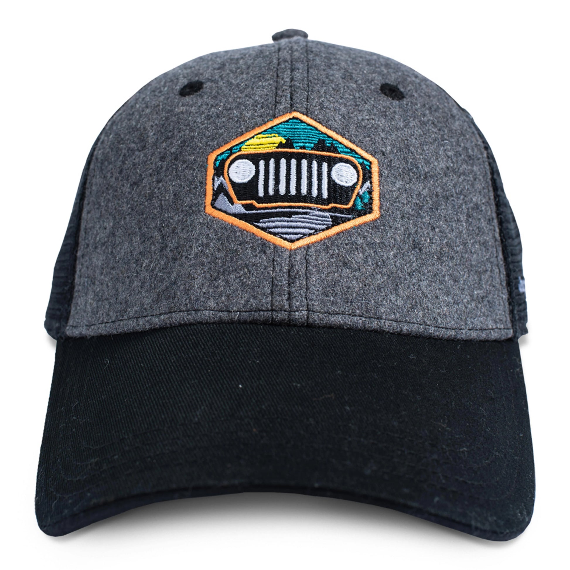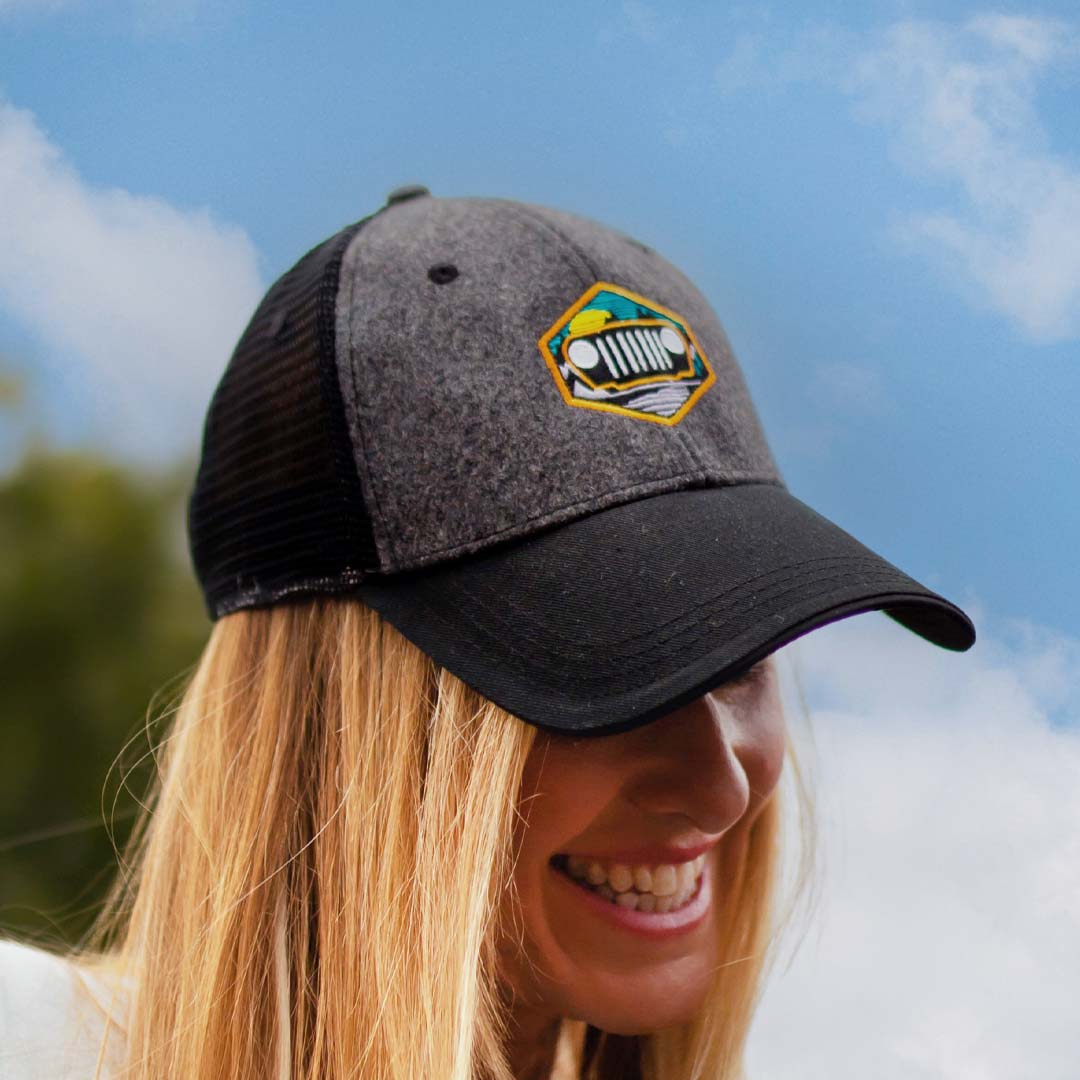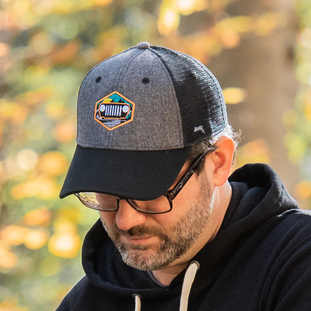 Throw on our Jeep® “Through The Mountains” Hat for a comfortable, relaxed fit while repping that seven slot lifestyle! Featuring a structured gray wool front panel with a vibrant embroidered Jeep® Grille against a mountain backdrop, this is a one-of-a-kind hat.