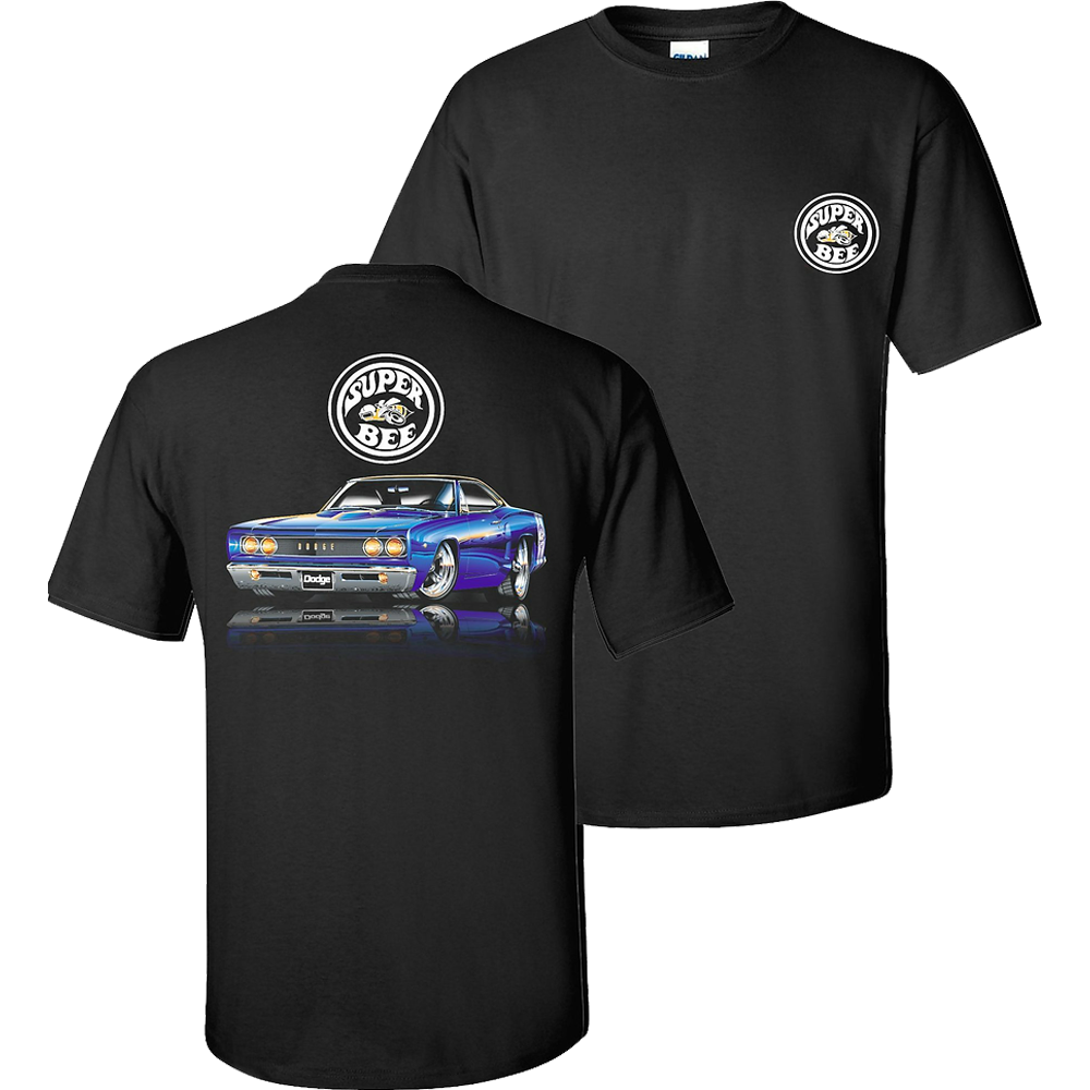 This awesome Super Bee design used to feature flames on the back of the shirt. It has been updated and now focuses solely on this beautiful car! Made of soft style 100% pre shrunk cotton.
