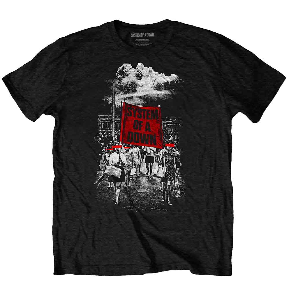 Officially Licensed System Of A Down Unisex Tee featuring the 'Banner Marches' design motif. This high quality t-shirt design is available in the black colourway.