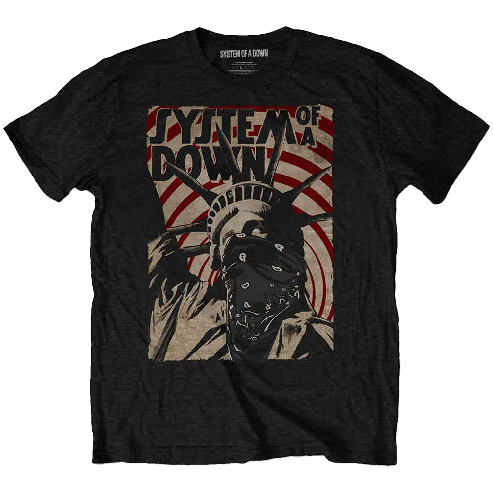 Officially Licensed System Of A Down Unisex Tee featuring the 'Liberty Bandit' design motif. This high quality t-shirt design is available in the black colourway.