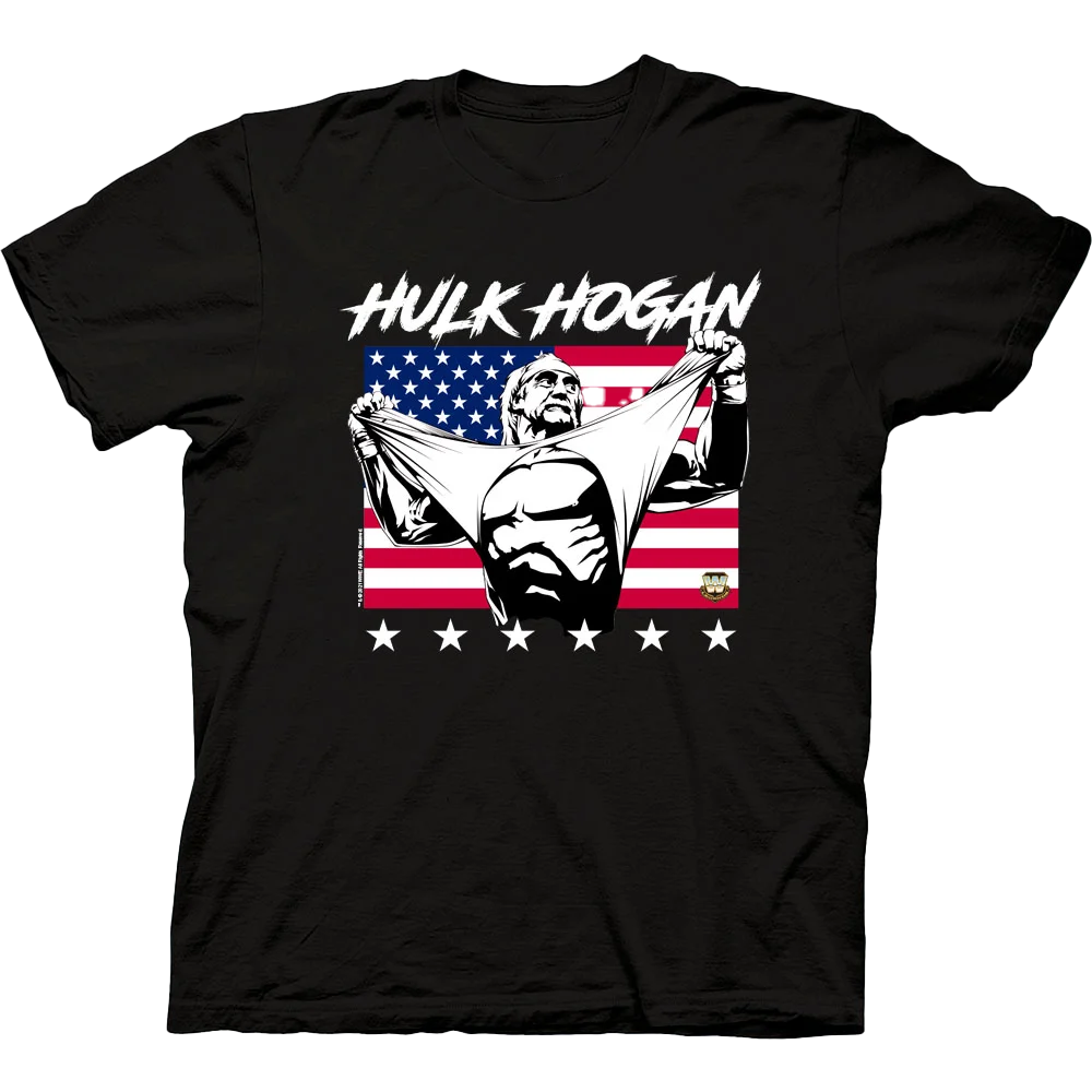 Feel the power of the Hulkamania with this WWE Hogan Shirt Rip with Flag adult unisex t-shirt, featuring an iconic and patriotic design that captures the energy and excitement of one of the most legendary wrestlers of all time, direct from our line of Officially Licensed WWE Merch!