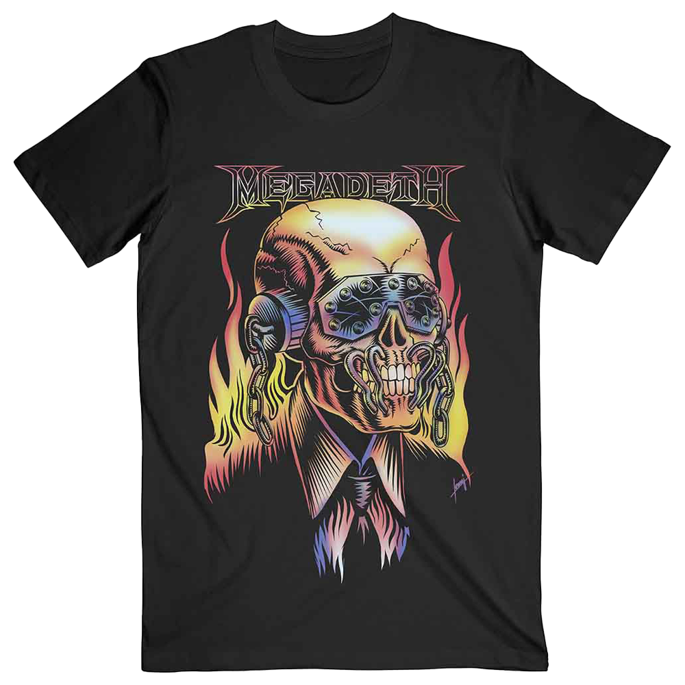 Officially licensed Megadeth Unisex Tee featuring the 'Flaming Vic' design motif. This high quality t-shirt design is available in the black colourway.